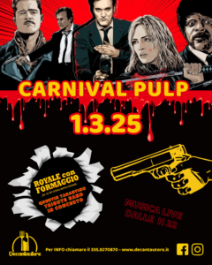 Sabato 1 marzo, preparatevi a un Carnevale da paura al Decantautore grazie ai Royale Con Formaggio – Quentin Tarantino Tribute, la band che dalle 22 ci farà rivivere le musiche indimenticabili di capolavori come Pulp Fiction, Le Iene, Kill Bill e tanti altri…
